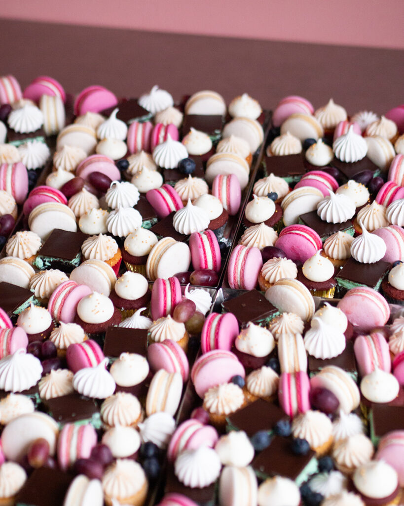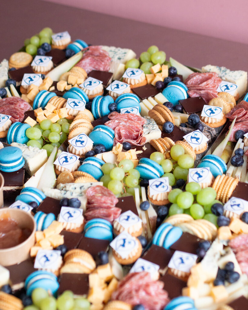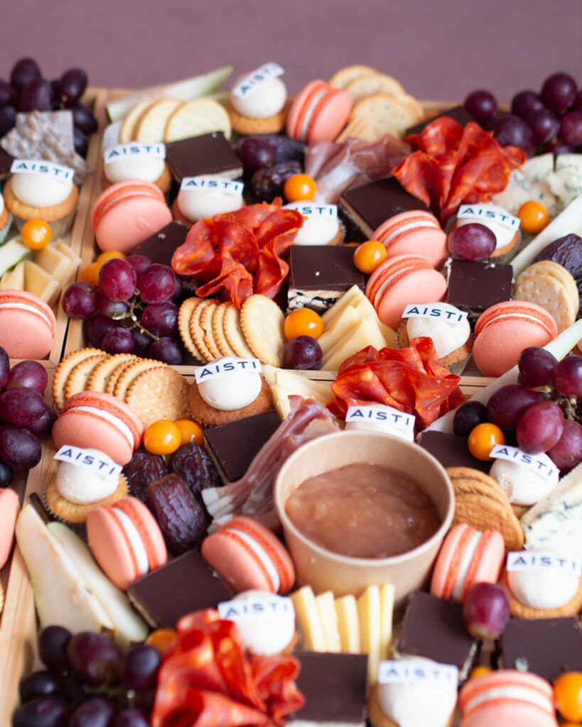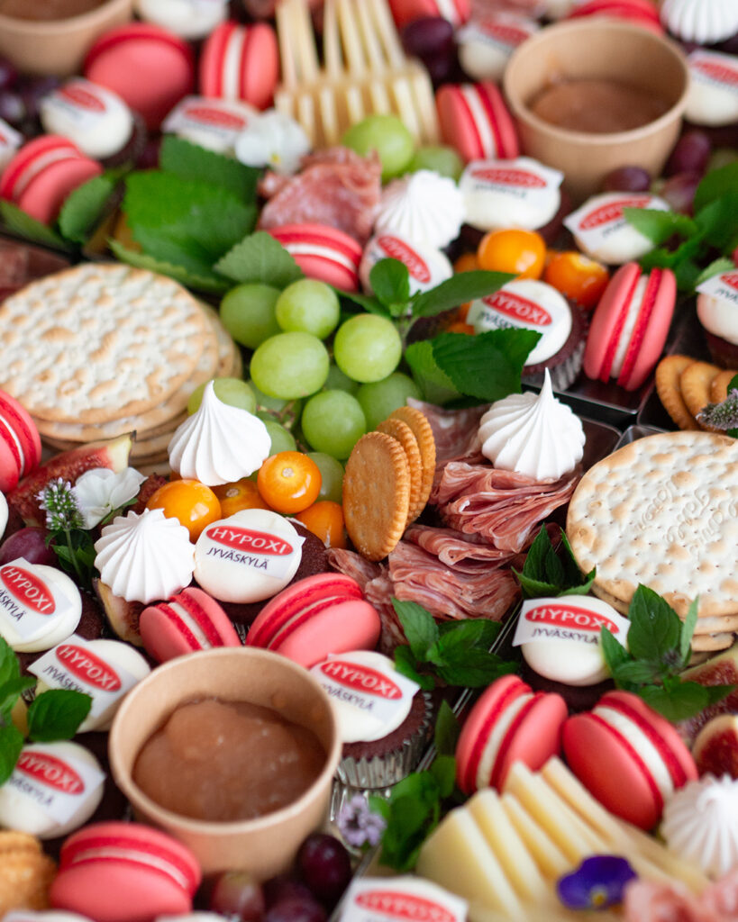 Näyttävä charcuterie tarjoilu sopii juhlaan kuin juhlaan. Tarjoilussa voidaan ottaa huomioon toivomanne värit esimerkiksi macaronien sävyissä sekä mini kuppikakkuihin voidaan lisätä myös syötävä logo päälle. Näin pöytä on sekä kuvauksellinen että herkullinen samaan aikaan. Platteri voidaan toteuttaa joko makeilla herkuilla, suolaisilla herkuilla tai näiden yhdistelmällä.